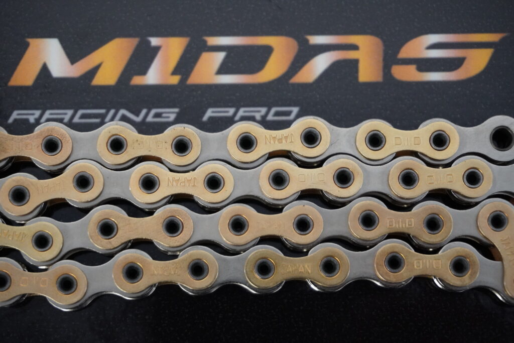 その為、ミダスは従来のピン頭出しではなく、ロードチェーンのように外プレートとピンがツライチになるようにデザインされました。時速75kmを超える走行中に上側のチェーンは空気の流れに逆行します。その中でピン頭出しだと空気抵抗になると考えたわけです。