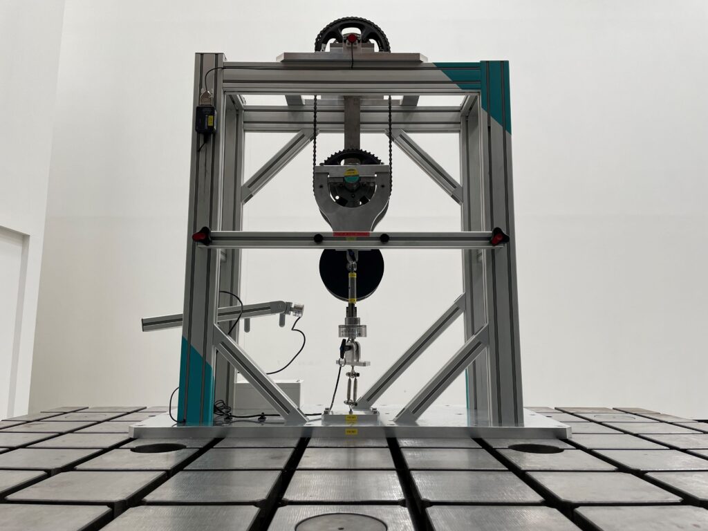 SSEHのチェーンテスト装置は機械式時計のような構造です。大きな振り子にオモリを付けて、振り子の揺れが止まるまでの時間を測ります。