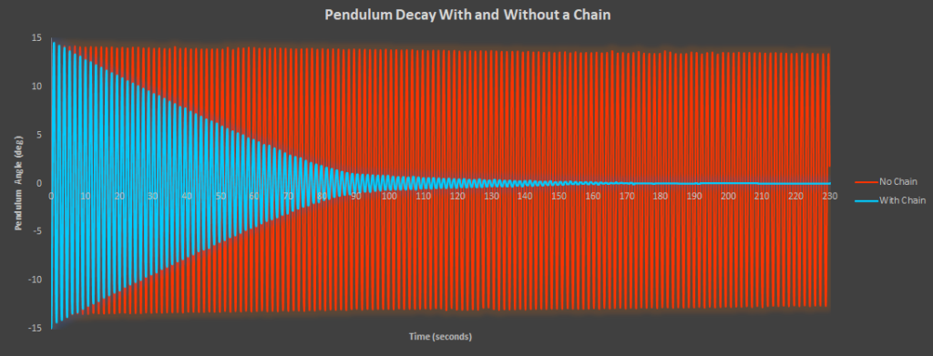 振り子をつけたチェーンの摺動抵抗が大きければ振り子は早く止まります。抵抗が少なければ振り子は揺れ続けます。(図中青色がチェーンの振れ幅。横軸の時間が経過するほど振れ幅が小さくなっていく)
